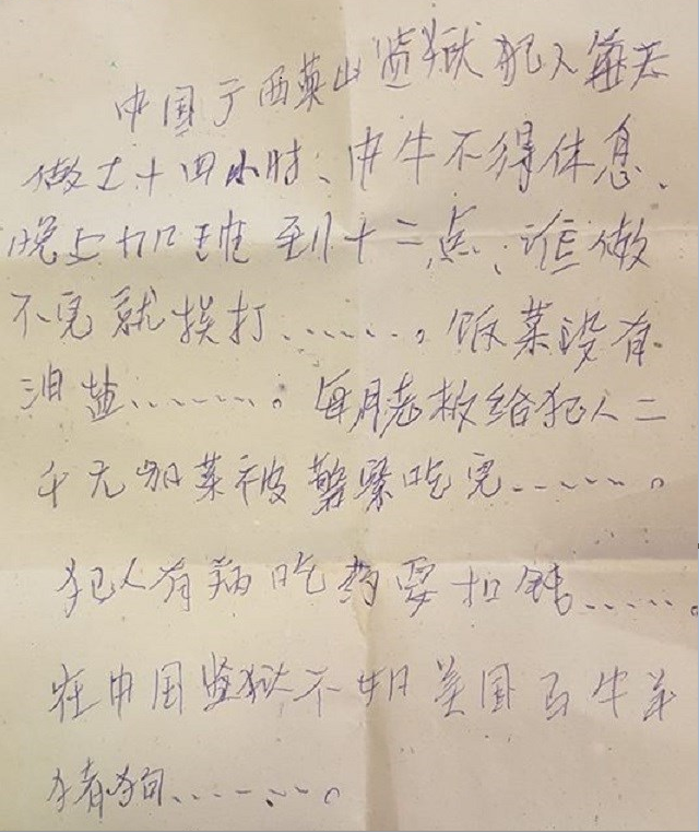 “Inmates in the Yingshan Prison in Guangxi, China are working 14 hours daily with no break/rest at noon, continue working overtime until 12 midnight, and whoever doesn't finish his work will be beaten. Their meals are without oil and salt. Every month, the boss pays the inmate 2000 yuan, any additional dishes will be finished by the police. If the inmates are sick and need medicine, the cost will be deducted from the salary. Prison in China is unlike prison in America, horse cow goat pig dog (literally, means inhumane treatment)."